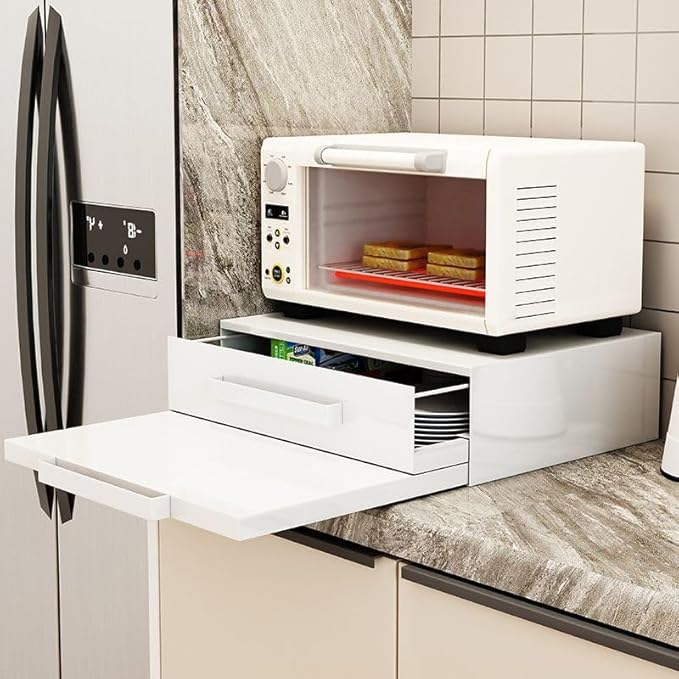 This countertop microwave stand crafted from high-quality stainless steel, this countertop microwave stand is built for longevity. Its smooth surface resists stains and is easy to clean, maintaining a pristine appearance. Stand for Kitchen Appliances, including Microwave, Coffee Maker, and Toaster: Designed primarily as a microwave stand for countertop, this versatile organizer also supports coffee makers, toasters, and other small kitchen appliances. This microwave stand features a minimalist and modern design, This one does not come with a drawer, while the generous size (18.5″ x 14.2″ x 1.6″) make it a perfect fit for any kitchen or coffee station. Compared to other stands, this microwave countertop organizer stands out with its cohesive and integrated design. transforming a chaotic countertop into a modern, cohesive space.