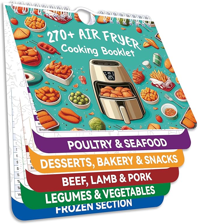 Stylish design incorporating easy-access tabs with large, reader-friendly fonts. We’ve made two key improvements: revamped menu item ordering and adjusted spacing between foods. These changes enhance readability and navigation for our customers. 7” x 7.8” inches with sturdy papers. Waterproof , tear-proof and easy to clean air fryer chart magnetic. Strong magnet on the back and robust hanging hook on the top that will provide years of value. Each foods has been tested in air fryers to provide accurate cooking times and temperatures. Experience accurate, hassle-free cooking for everyday meals with our expertly crafted