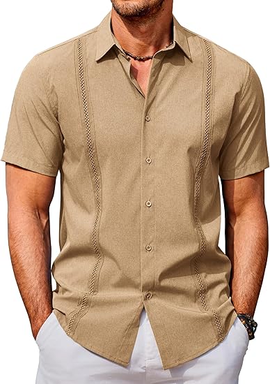 Men’s Cuban shirt is made of premium linen texture materials, providing ultimate comfort. It’s breathable, soft and cool to the touch, keeping you feeling fresh and looking energetic all day long. Men’s guayabera shirt features classic spread collar, short sleeves, button closure and elegant distinctive embroidered design. This exquisite details of design makes this shirt more fashionable and classic. To keep this men’s beach shirt looking its best, machine wash it in cold water and hang it to dry. Whether it’s a beach day, vacation, casual outing, cruise, wedding, or semi-formal event, this men’s summer shirt fits seamlessly in any occasions. It’s also the ideal gift for husbands, fathers, sons, or friends and so on.