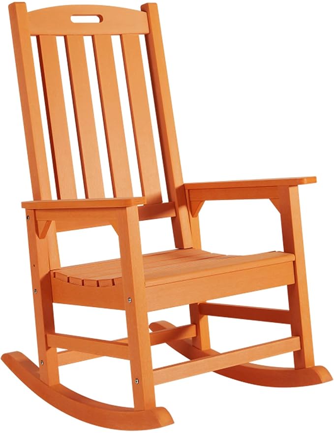 Seat measuring 21″ wide, accommodating ample body sizes, paired with a 32″ tall backrest providing head support, while other rocking chairs on the market have backrests that only support your neck. Streamlined installation process with pre-assembled nuts. Simply screw 12 identical screws into pre-drilled holes. Refer to the assembly video for installation steps. Due to its weight, it’s recommended that two people install the chair together. high-quality rocking chairs feature a unique wood-like color technology. We forgo the exaggerated wood grain found in traditional poly lumber to showcase the most authentic and pure wood texture. It’s challenging to distinguish the difference between our products and high-grade solid wood. We utilize recycled polystyrene materials as a sustainable alternative to diminishing wood resources. Rocker chairs made in this manner are robust and enduring, capable of withstanding various weather conditions, without chipping, cracking, peeling, or rotting