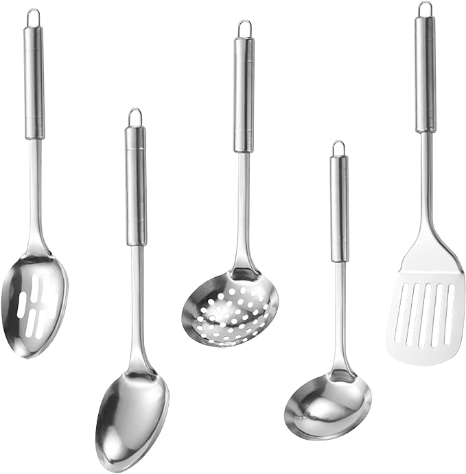 Stainless steel kitchen utensils are sturdy than other kitchen utensils. They can be used continuously for many years without cracking or bending, and will not react with any food. You can stir directly in the pot. Healthy for daily use. This kitchen tools & gadgets set is designed for functionality. Each cooking utensil has a hanging loop that can be hung in your kitchen. it can greatly reduce the mess in the kitchen. To keep them together in a drawer or to hang anyplace. Stainless steel cooking utensil are easy to wash. Wash by hand with soap and warm water and have a gleaming set in no time. You can also stick it into the dishwasher, as a set is completely dishwasher safe.