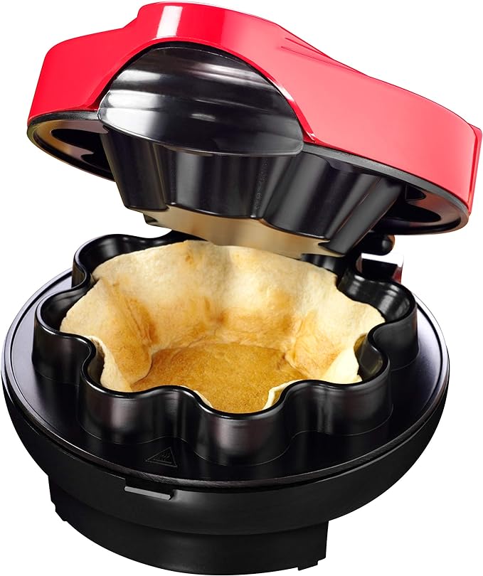 Add to the fun of taco and create flawless taco salads and guacamole bowls in no time. This electric tortilla press bakes up to 8-10 inch store-bought tortillas into mouthwatering crispy and perfectly shaped bowls. Two indicator lights will let you know when it’s ready. Cook time is 1-3 minutes, and the dual nonstick surfaces provide an even bake for consistency. The flour tortilla press includes a locking latch to keep the shell firmly in place. The compact electric tortilla maker looks great on your counter or table. It’s made from sturdy plastic, has a nonstick cooking surface for easy cleaning, and has a space in the bottom of the unit to hide the cord.